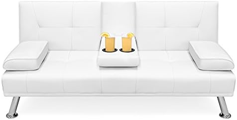 Best Choice Products Modern Faux Leather Convertible Futon Sofa Bed Recliner Couch W Metal Legs 2 Cup Holders White