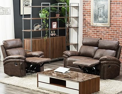 Flieks 2 Piece Recliner Sofa Set Brown Leather Sofa Reclining Sofa Chair Bonded Sofa Couches For Living Room 1 Seat Loveseat