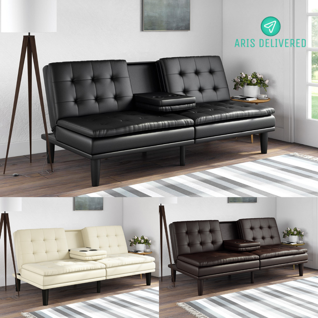 Memory Foam Futon Sofa Bed Faux Leather Pillow Top Couch Seat With Cup Holder