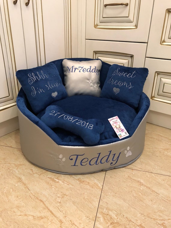 Silver And Navy Blue Luxury Dog Bed Faux Leather Pet Bed Designer Pet Bed Custom Made Dog Bed Personalized Bed Dog House Silver Dog Bed