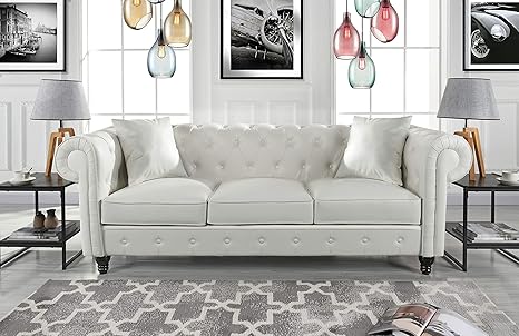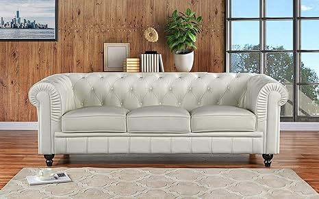 Divano Roma Furniture Classic Living Room Bonded Leather Scroll Arm Chesterfield Sofa White