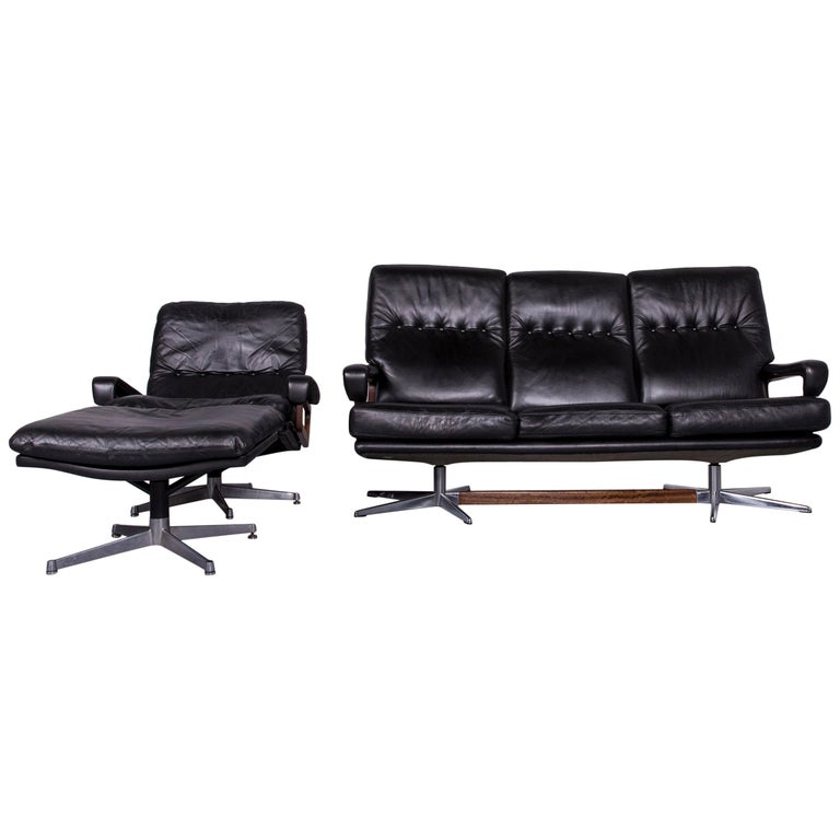 Strassle King Designer Black Leather Set Armchair Footstool Three Seat Couch