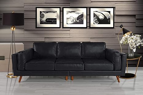 Upholstered Mid Century Modern Tufted Leather Sofa 96 W Inches Black