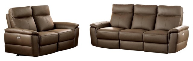 2 Piece Obara Power Double Recliner Sofa Love Seat Leather Brown Taupe