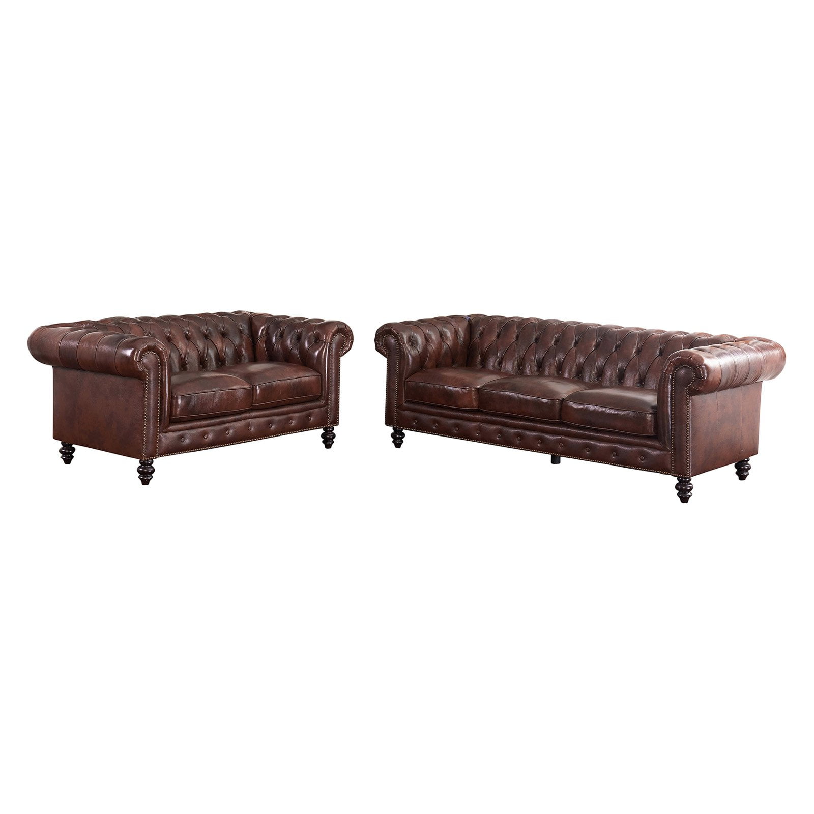 Abbyson Grand Chesterfield Brown Top Grain Leather Sofa Set