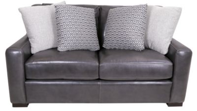 Due to differences in screen resolutions the fabrics and finishes displayed may vary from the actual fabric and finish colors. 360h x 930w x 410d. The buttery leather upholstery in a rich gray hue and four chic accent pillows make this a striking addition to any space.