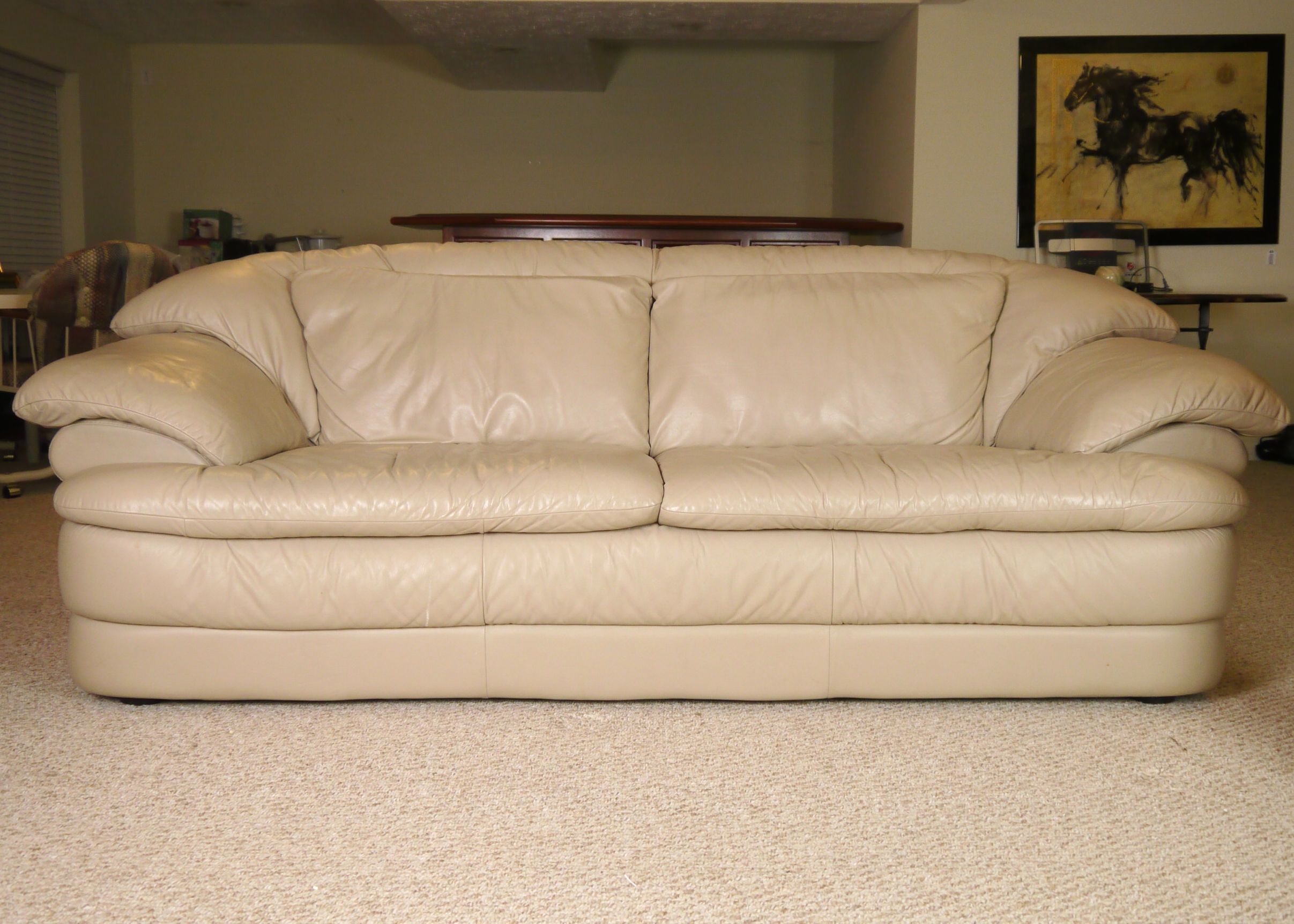 Ivory Sofa With Brown Leather Pillow Top Ottoman Cottage
