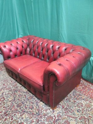 Red Leather 2 Seater Chesterfield Sofa 1980s