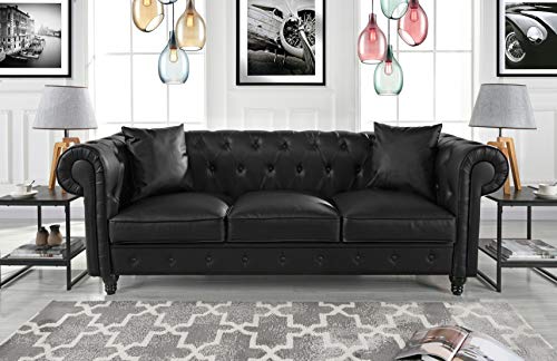 Divano Roma Furniture Classic Living Room Bonded Leather Scroll Arm Chesterfield Sofa Black