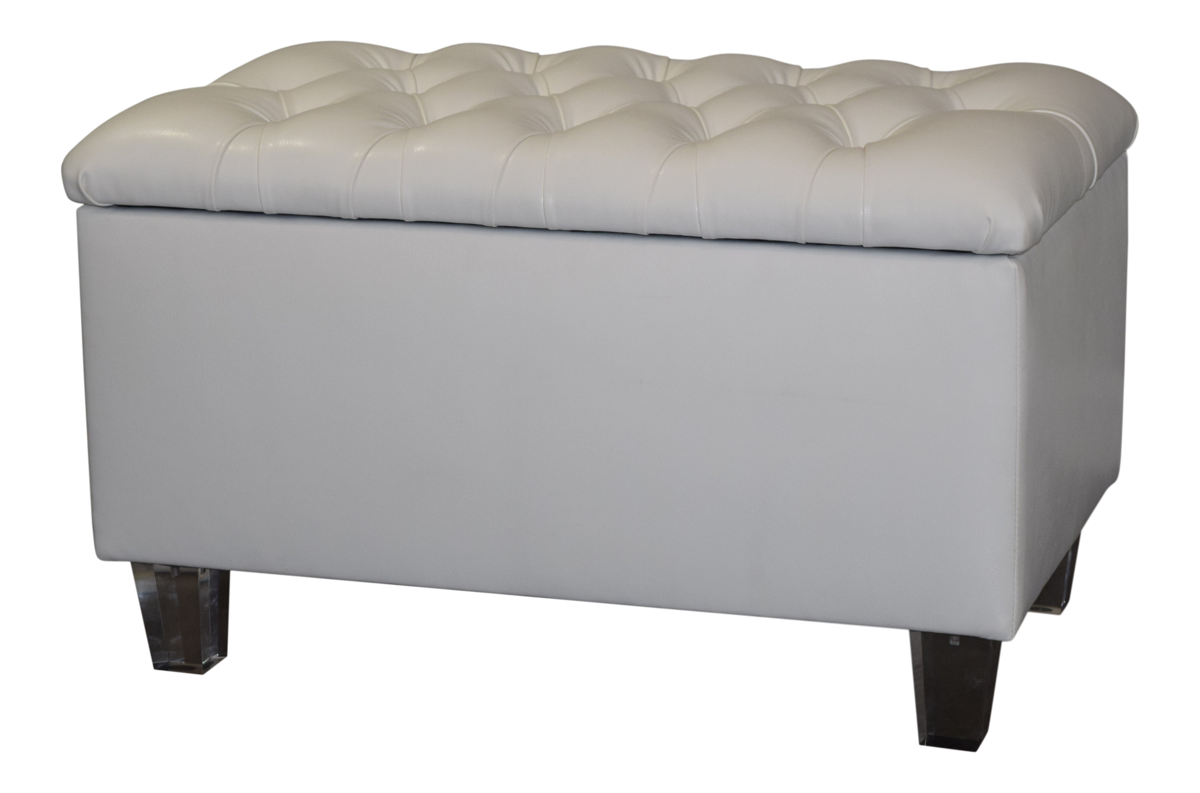 Diamond Tufted Storage Bench Ottoman In Off White Faux Leather With Clear Acrylic Legs