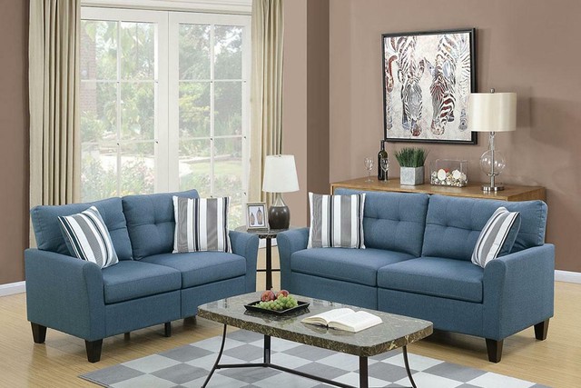 Modern Blue Fabric Upholstered Sofa Loveseat Set 2 Pcs F6535 Poundex