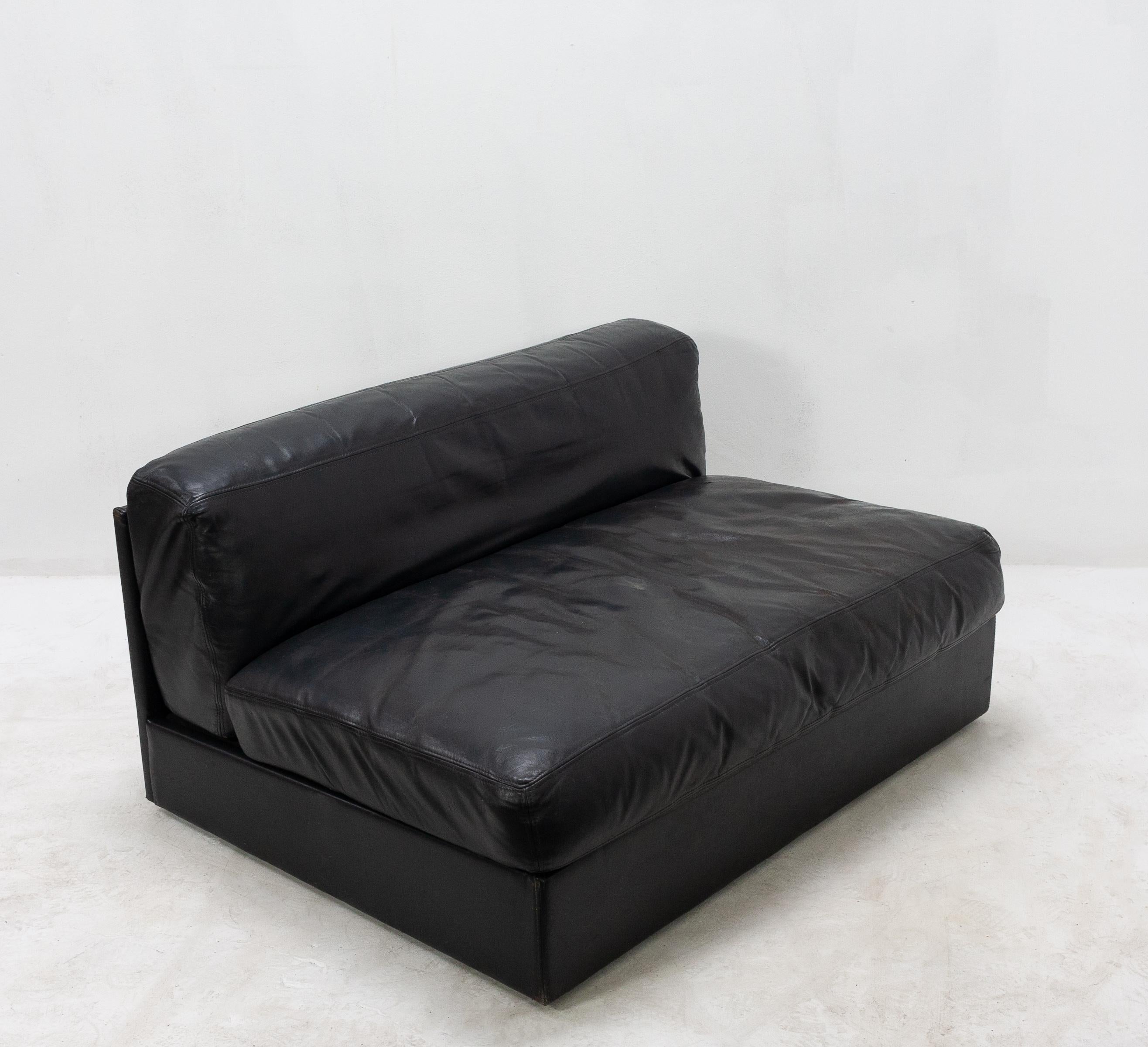 Low Two Seat Black Leather Sofa Or Loveseat 1960s