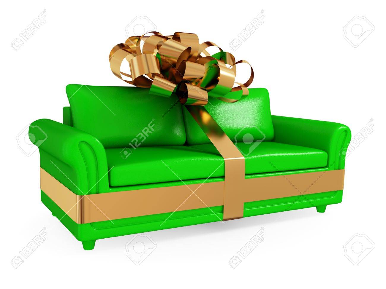 Green Leather Sofa Wrapped With Golden Ribbon Big Sale Concept