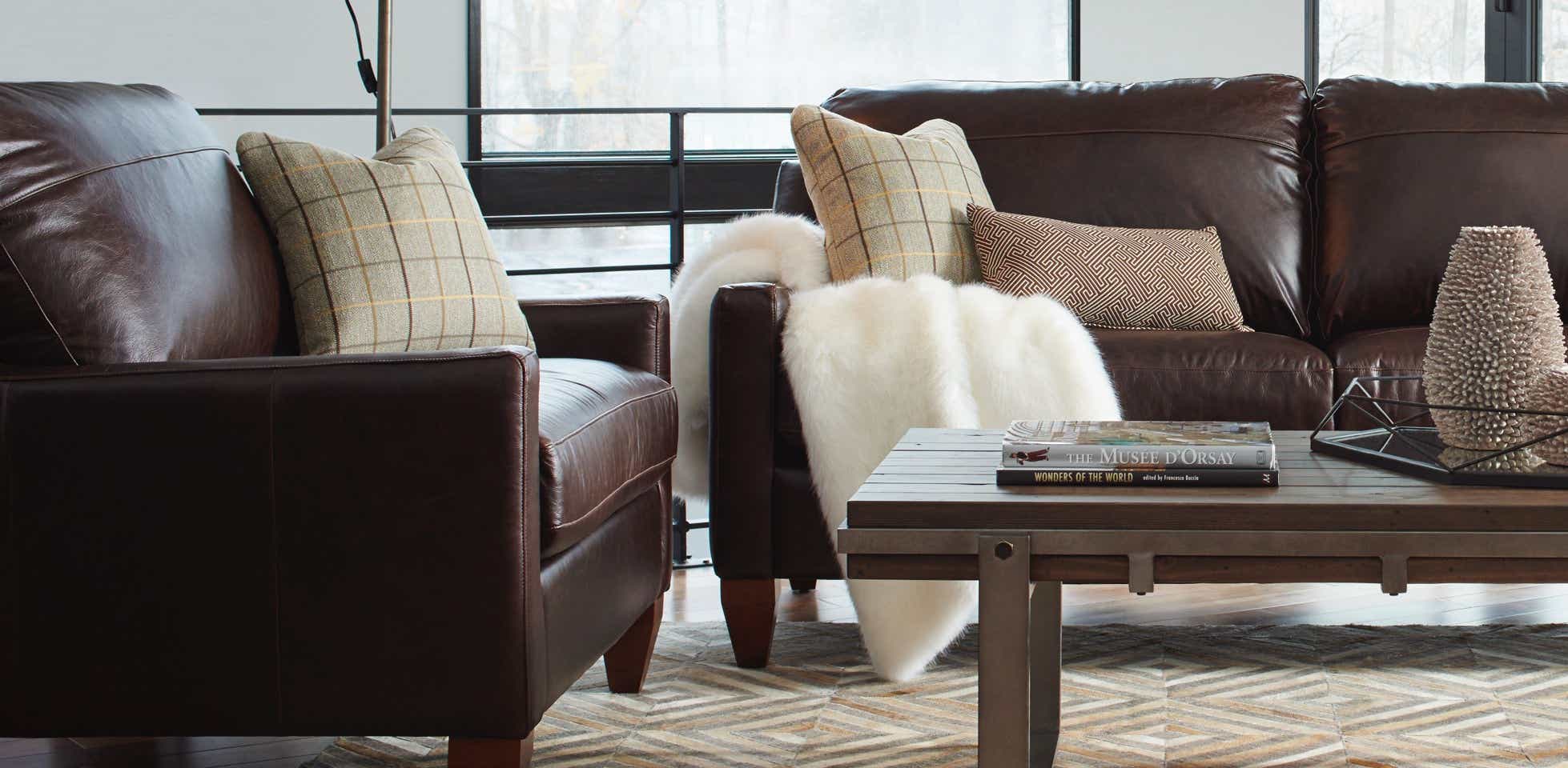 Take the focus away from leather furniture by layering a room with other furnishings in different finishes from bookcases to console tables to ottomans and end tables. Katy furniture c 2019 all rights reserved.