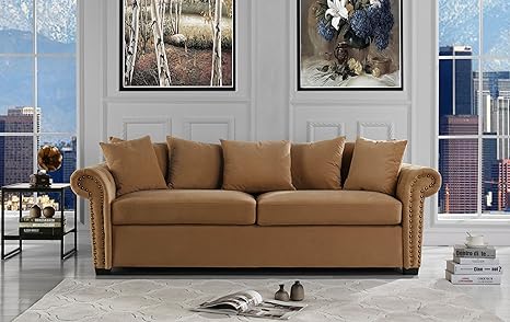 Classic Scroll Arm Velvet Living Room Sofa With Nailhead Trim Brown