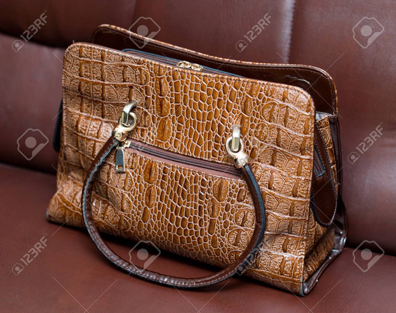 Leather Handbag From Crocodile Leather On A Brown Leather Couch