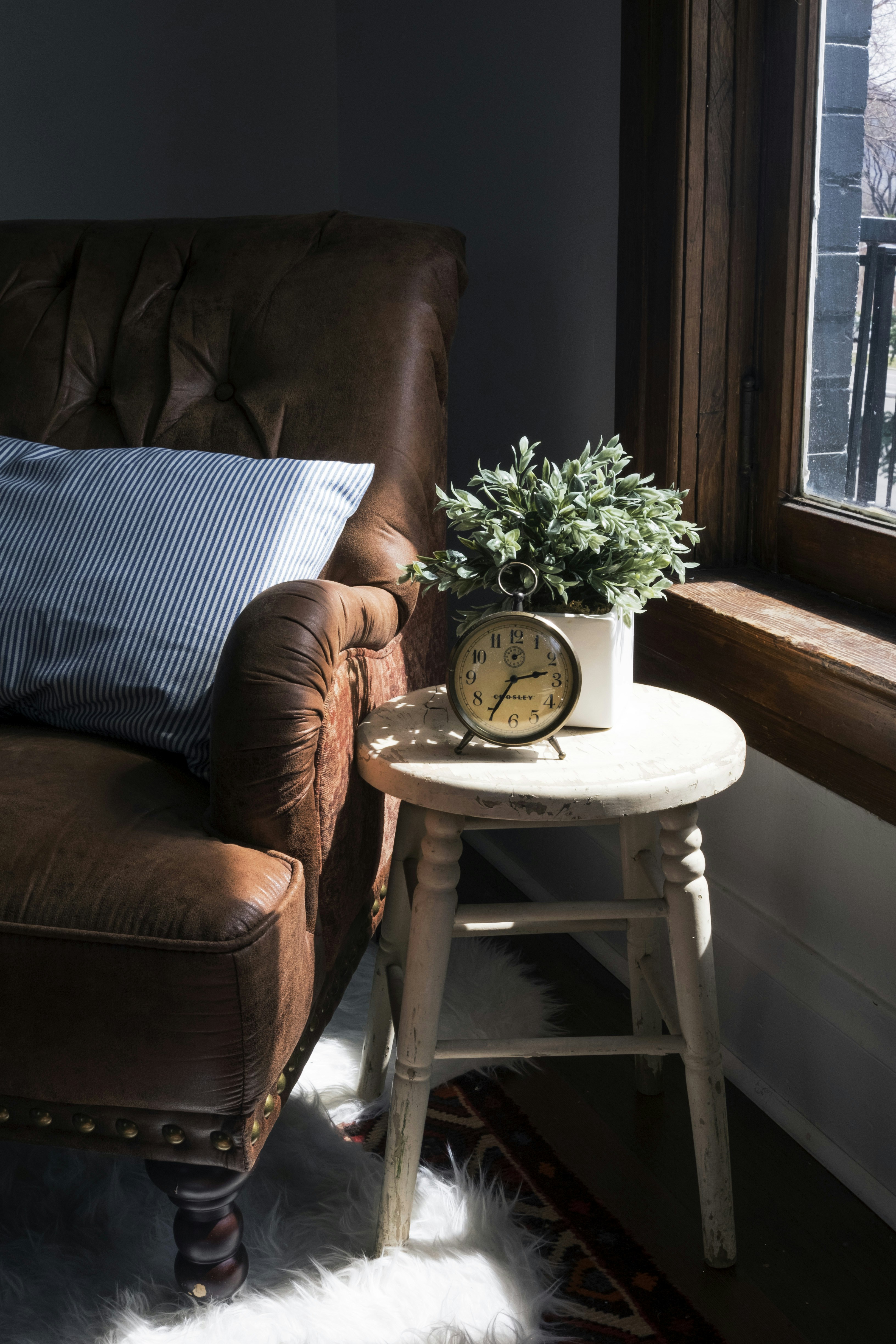 Brown Leather Padded Sofa Armchair Next To White Wooden