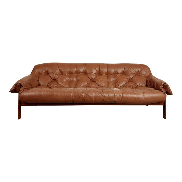Percival Lafer Rosewood And Distressed Leather Tufted Sofa Brazil Circa 1960