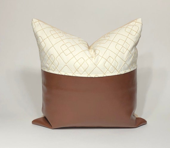 Brown Faux Leather Cream Woven Pillow Modern Pillow Decorative Pillow Cover Accent Pillow Farmhouse Pillow Throw Pillow Cover