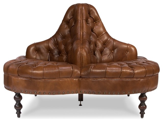 57 Wide Round Sofa Top Grain Leather Light Brown Tufted Classic Traditional