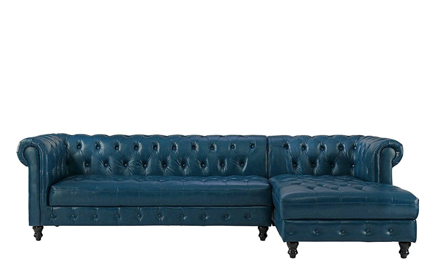 Classic Real Tufted Leather Chesterfield L Shape Sectional Sofa With Wide Chaise Blue