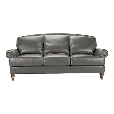 Crafted with button tufted top grain leather over a kiln dried hardwood frame this rolled arm sofa has two removable seat cushions for a great mid century look and its just right paired with your favorite accent cushions. Featuring top grain leather in gray with white contrast stitching rolled arms and nailhead trim this sofa and loveseat set adds classic sophistication to your living room.