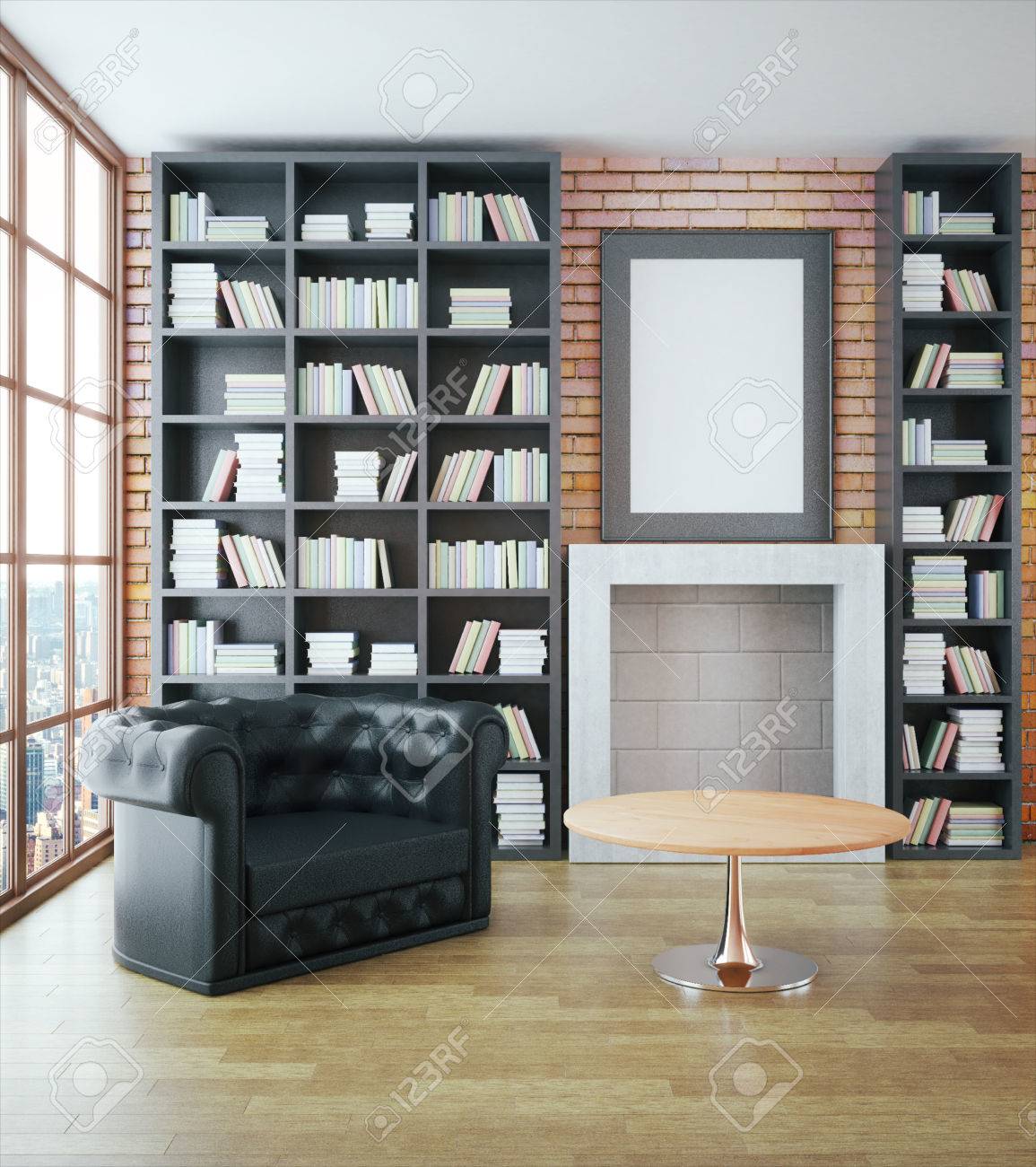 Luxurious Library Interior With Black Leather Sofa Bookshelves