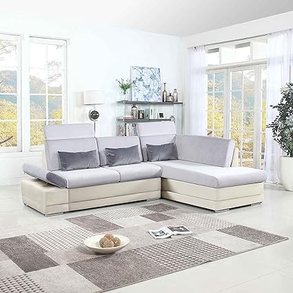 Classic Large Faux Leather And Microfiber L Shape Sectional Sofa Couch With Chaise Lounge And Adjustable Headrest White Light Grey