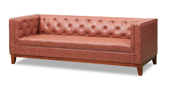 Mid Century Danish Style Modern Tufted Sofa With Walnut Legs Contemporary Couch Upholstered With Brown Pu Leather Sofa Retro Design Look