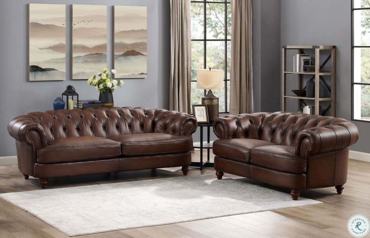 Stanwood 100 Leather 3 Piece Set Sofa 2 Armchairs In Tufted Brown W Nailheads By Amax Leather